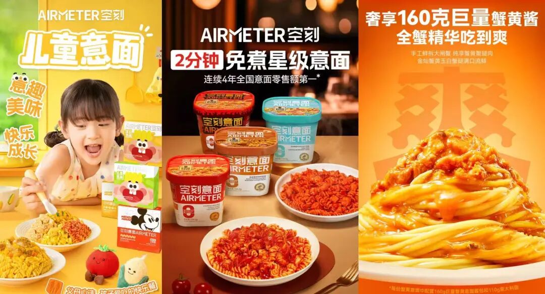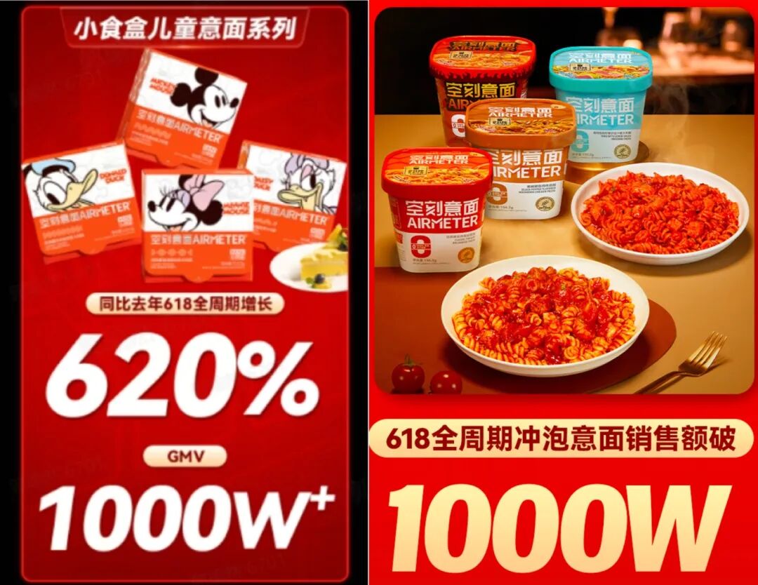 去年,空刻基于原先的意面品類心智,推出“沖泡意面”新品,上市即售罄,今年再度上新口味,并于 618 大促期間狂銷 1000 萬元[2]。