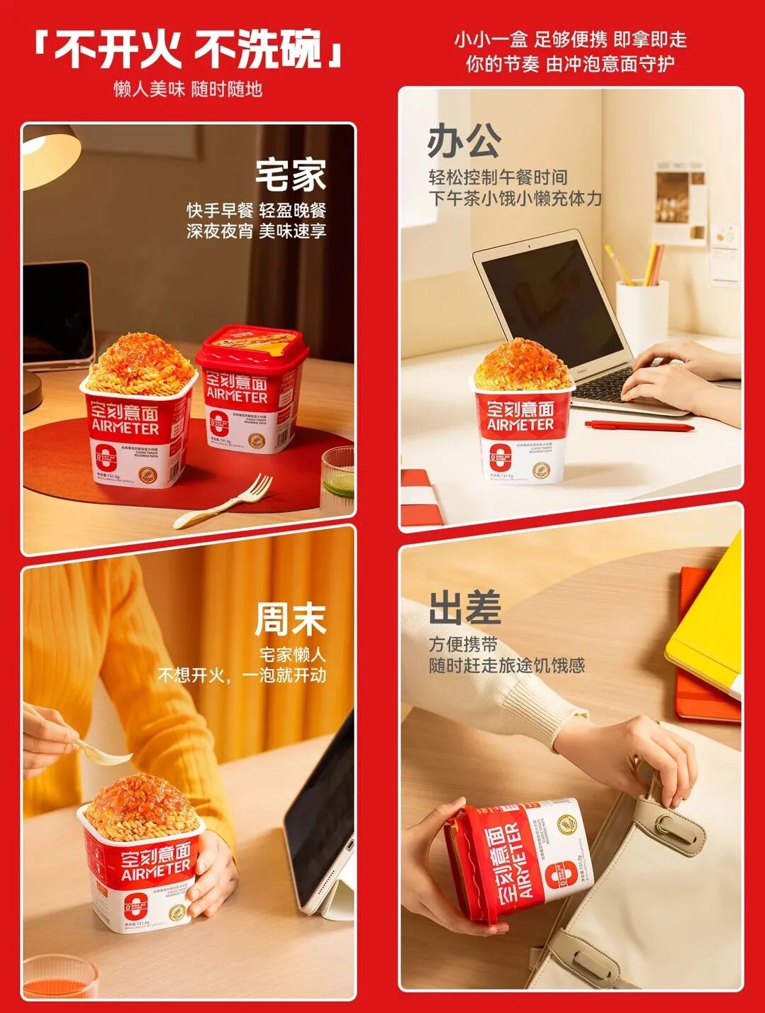 沖泡意面的思路更多樣化。在宅家、辦公、出差的傳統場景下結合目標消費人群做洞察,強調不同的需求痛點。比如,宅家是“不開火、不洗碗”,辦公則抓住了白領需要快速解決午飯的需求。二是,在場景上進一步“創造”?;趹敉廒厔莼馃?,空刻用 2 分鐘和免煮黑科技強調即泡即食。