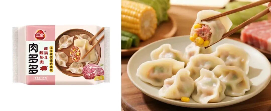 三全肉多多系列水餃產品,以“肉多多”為根基,放大產品的餡料和個頭,一只水餃20g,是正常餃子的1.3倍,個頭大的同時,餡料也十分扎實,超多肉、超滿足。產品包含三鮮水餃、豬肉白菜水餃、豬肉香菇水餃、玉米蔬菜豬肉水餃等多種口味。