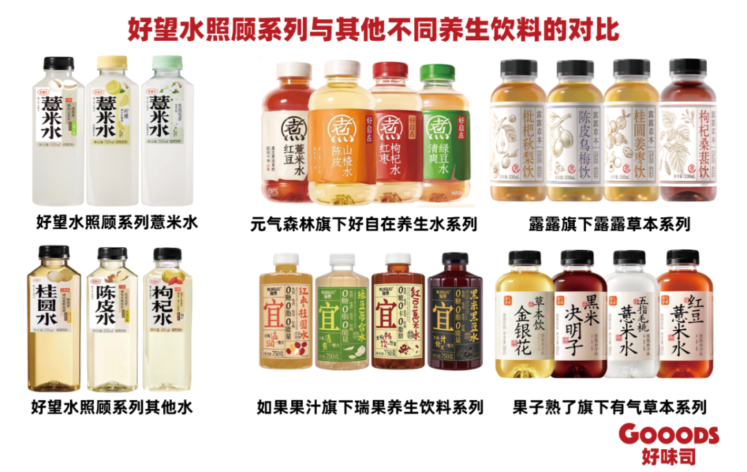好望水照顧系列與其他不同養生飲料的對比,圖片來源:Gooods制圖