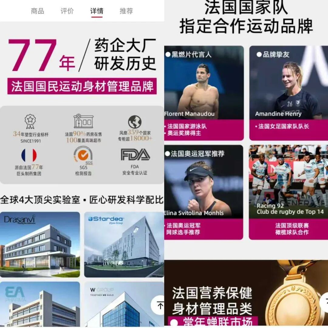 現在國內賣的 EAFIT,全是法國原裝進口,通過跨境貿易在電商平臺銷售。這種 “制藥級背景 + 國家隊運動員背書” 的組合,在充斥著 “三無減肥產品” 的市場里,一下就戳中消費者 “怕踩坑、求安心” 的痛點。