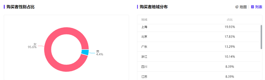 從千瓜數據后臺看,?購買 EAFIT 的用戶有 95.6% 是女性,主要分布在上海、北京、廣東、浙江等經濟發達地區。