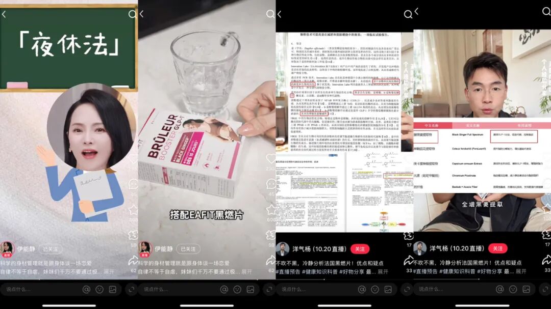 比如,@伊能靜?就在視頻中手把手教妹妹們用夜休法減肥,用 EAFIT 黑燃片搭配三餐食譜,讓總是嘴饞的妹妹們也能減肥事半功倍;而做了 6 年減脂博主的?@洋氣楊?的視頻則強調“冷靜分析優點和疑點”,從文獻資料、試驗報告、成分表分析、注意事項、品牌認證和產品對比逐條分析講解,既是產品種草,也為帶貨直播引流。