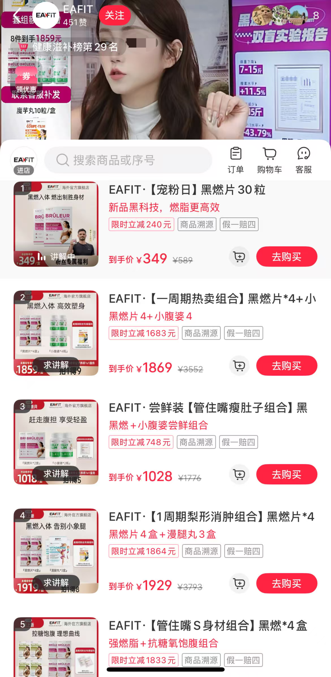可讓人意外的是,在數萬款 “蹭減肥流量” 的商品里,賣得最火的竟然是一款進口膳食補充劑——EAFIT 燃卡 1000?。一盒的優惠價也要 358 元,明明比同類產品貴出一截,卻硬生生賣出 20.6 萬 + 件,單鏈接成交額超 7300 萬元。