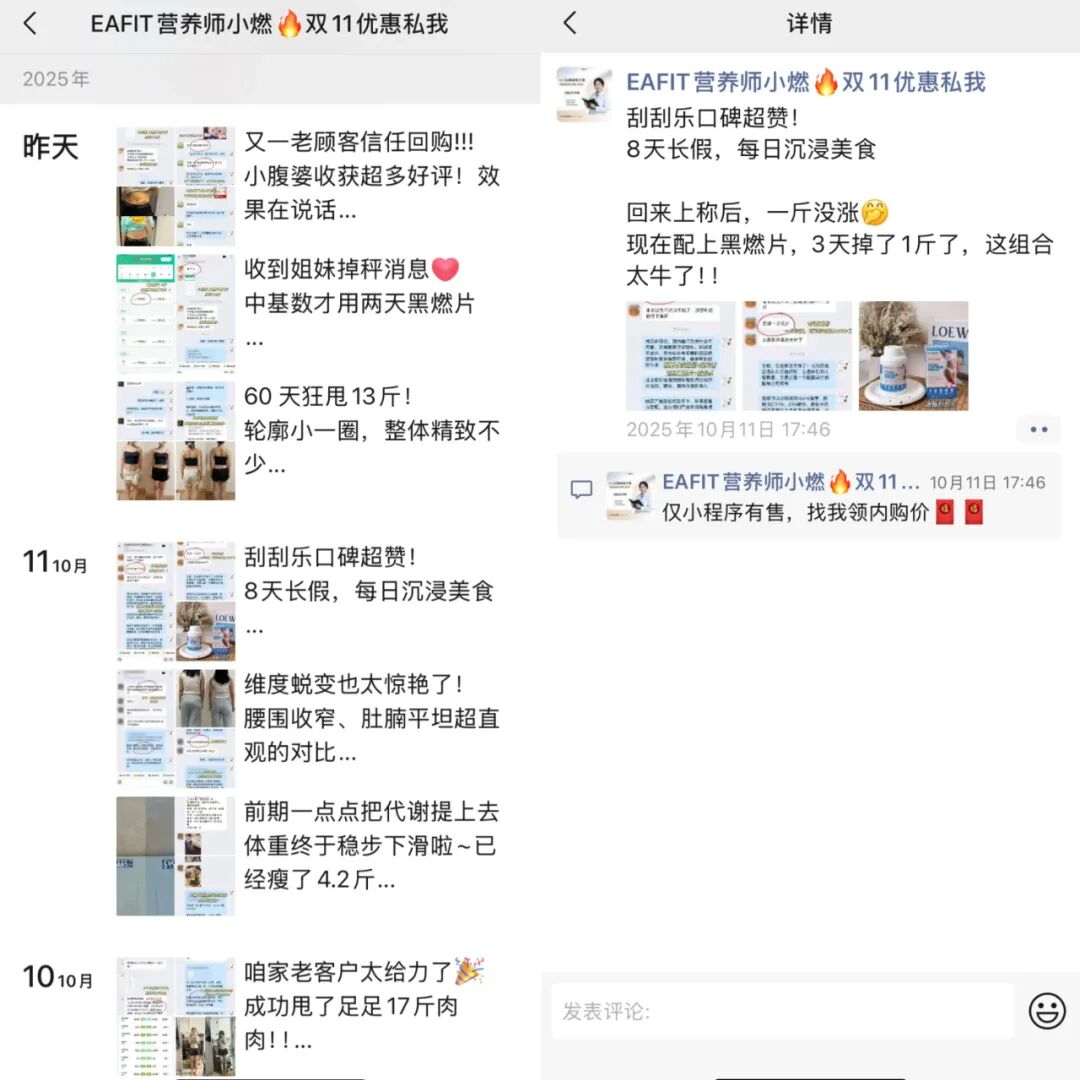 除了 1V1 聊天外,營養師還以 “早中晚三檔更新” 的頻率運營朋友圈,就干兩件事:一是持續推送真實減肥案例,用直觀的效果為產品背書,強化用戶使用信心;二是釋放老客復購優惠、限時促銷福利等信息,以 “利益點” 吸引用戶主動私聊,推動私域內二次轉化。