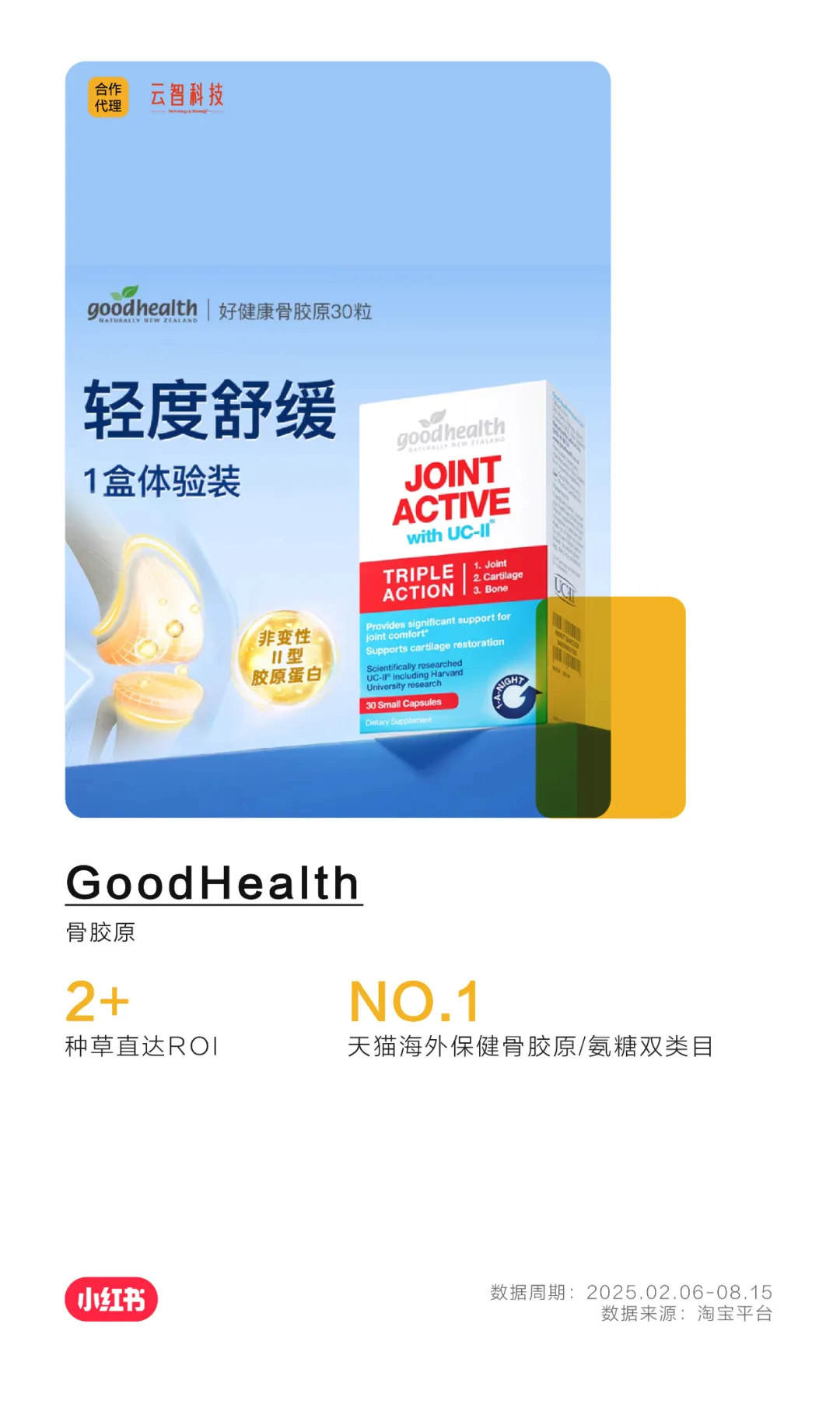 諸多食飲成長型品牌就借此在過去幾個月實現突圍,比如GoodHealth便一舉躍升至天貓海外保健膠原/氨糖雙類目的NO.1[3]。