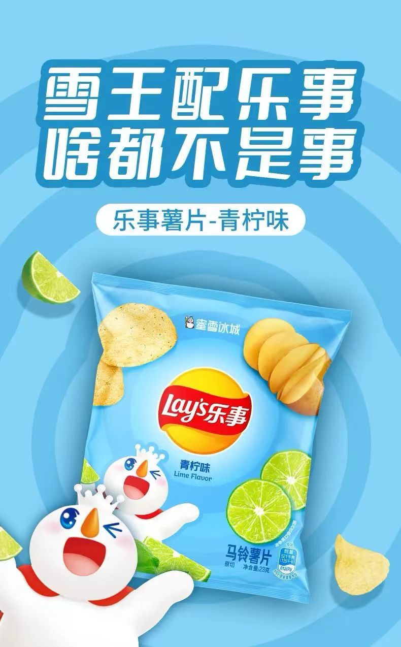 近日,據媒體報道,蜜雪冰城聯合樂事推出青檸味薯片,包裝上印有其標志性雪王形象。該產品目前已經在蜜雪冰城官方旗艦店上銷售,售價為23g*6包/14.9元。(來源:蜜雪冰城)原文鏈接